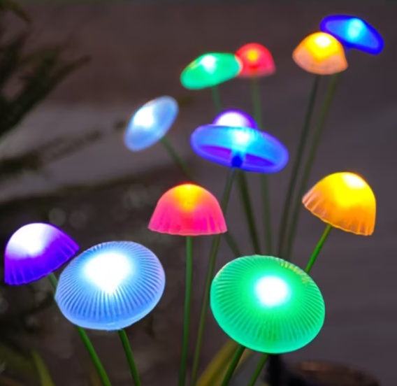 Dekoracyjna lampa solarna ogrodowa w kształcie grzybków i meduzy to efektowne oświetlenie zewnętrzne, które tworzy romantyczny i klimatyczny nastrój w ogrodzie, na ścieżce, trawniku lub patio. Model wyposażony w 10 punktów LED w formie kolorowych grzybków zapewnia wyjątkowy efekt wizualny po zmroku.